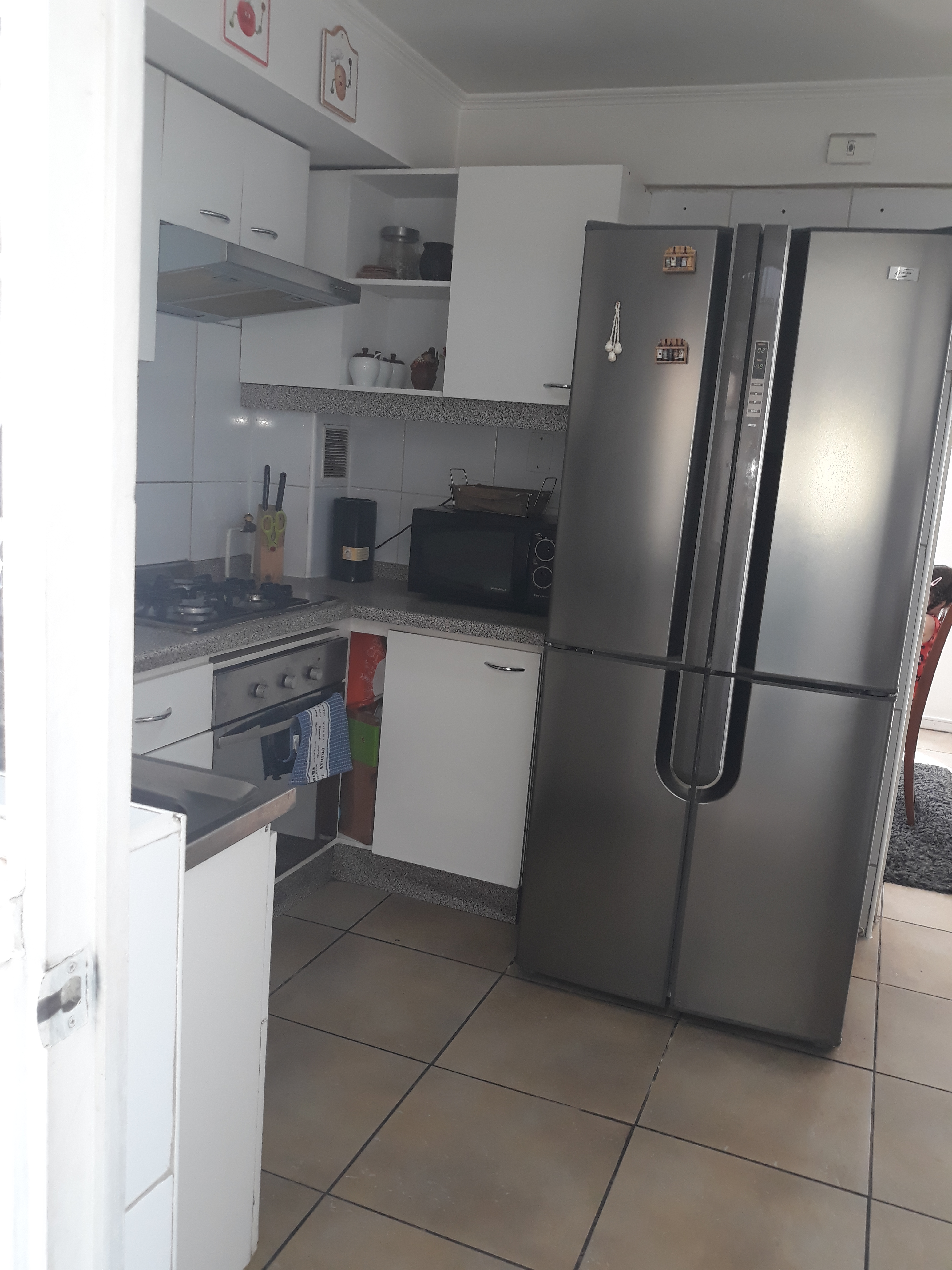- Cocina amplia, con refrigerador de 2 puertas, equipada con encimera, horno, campana y muebles.