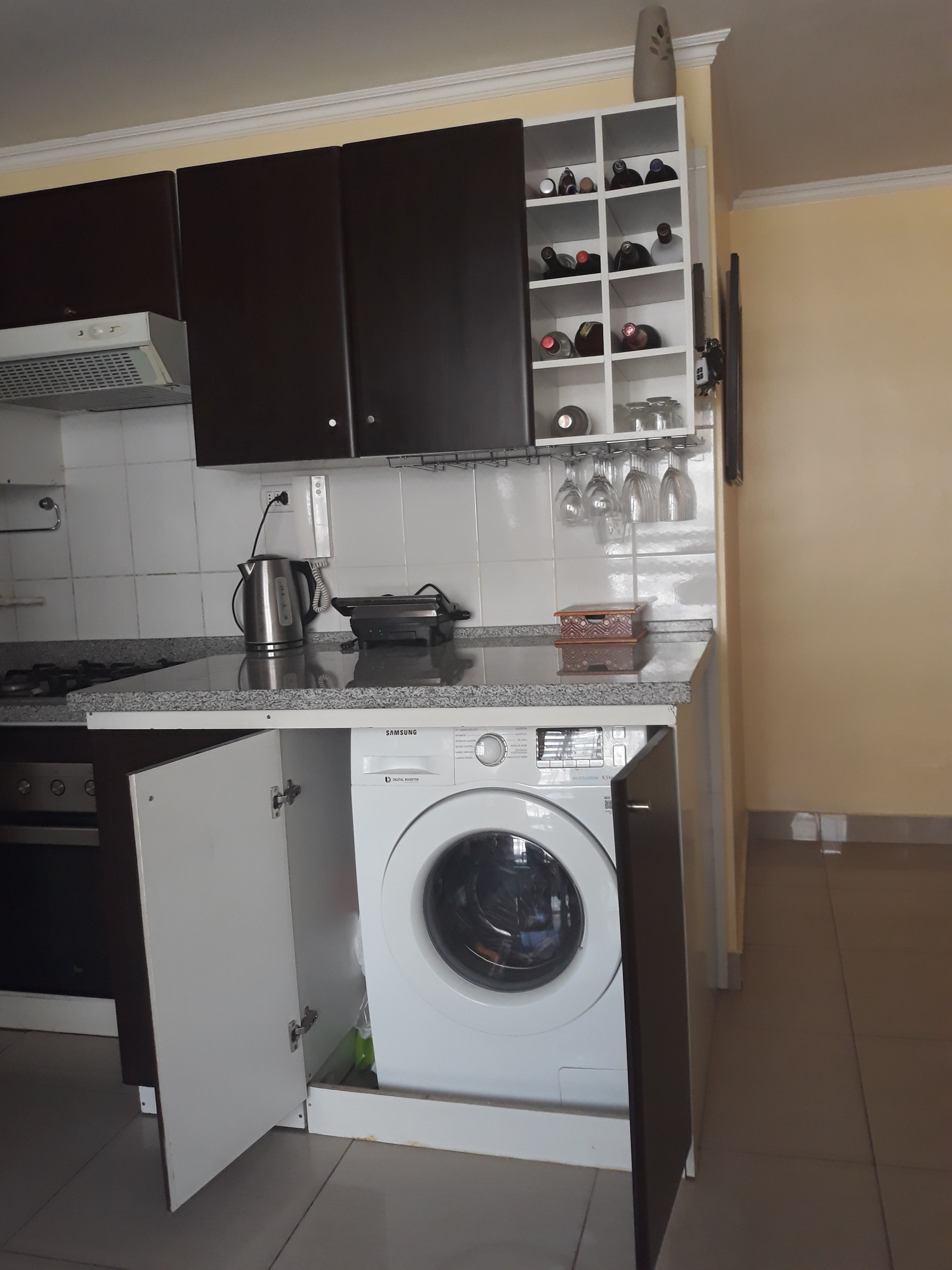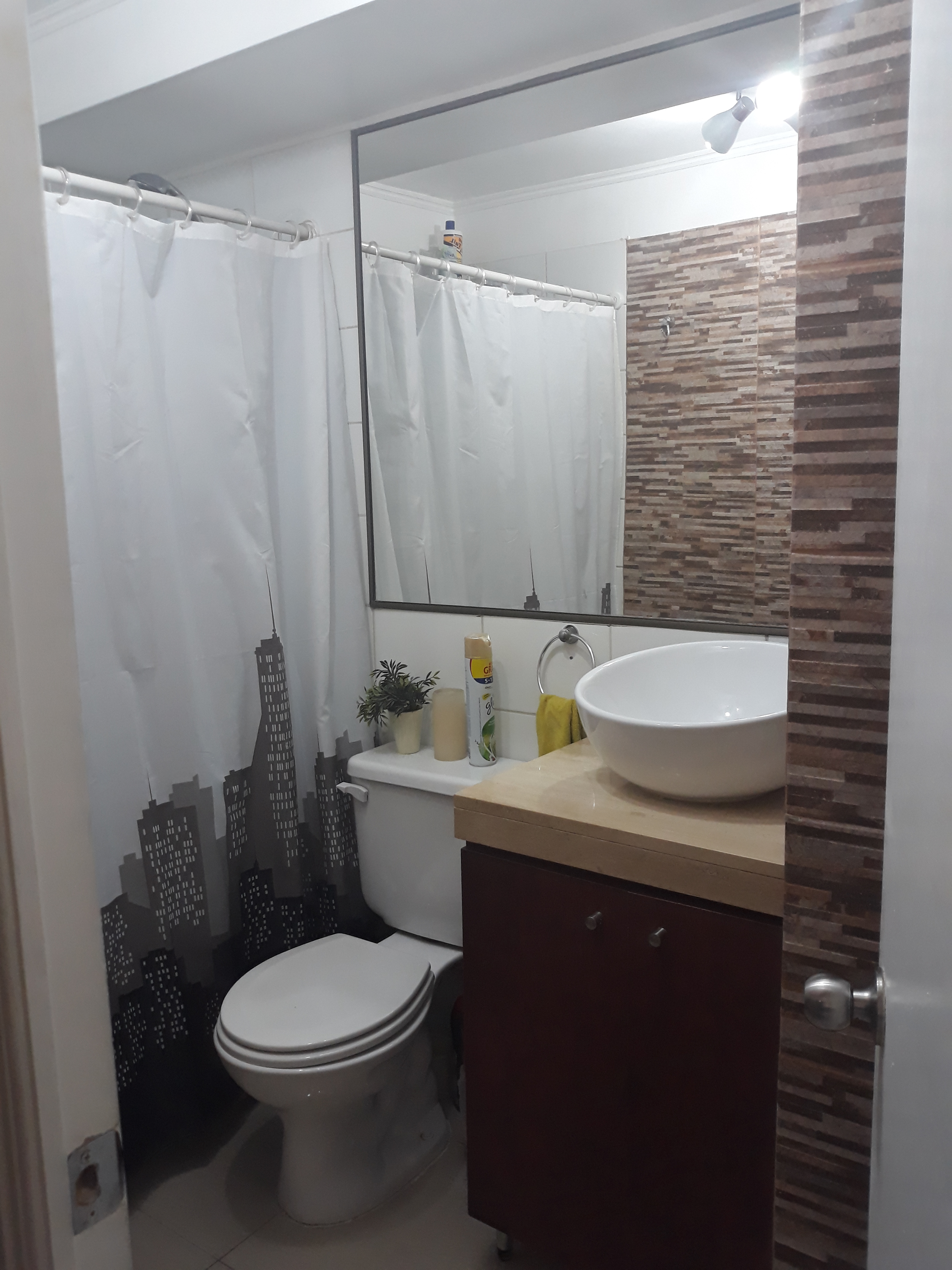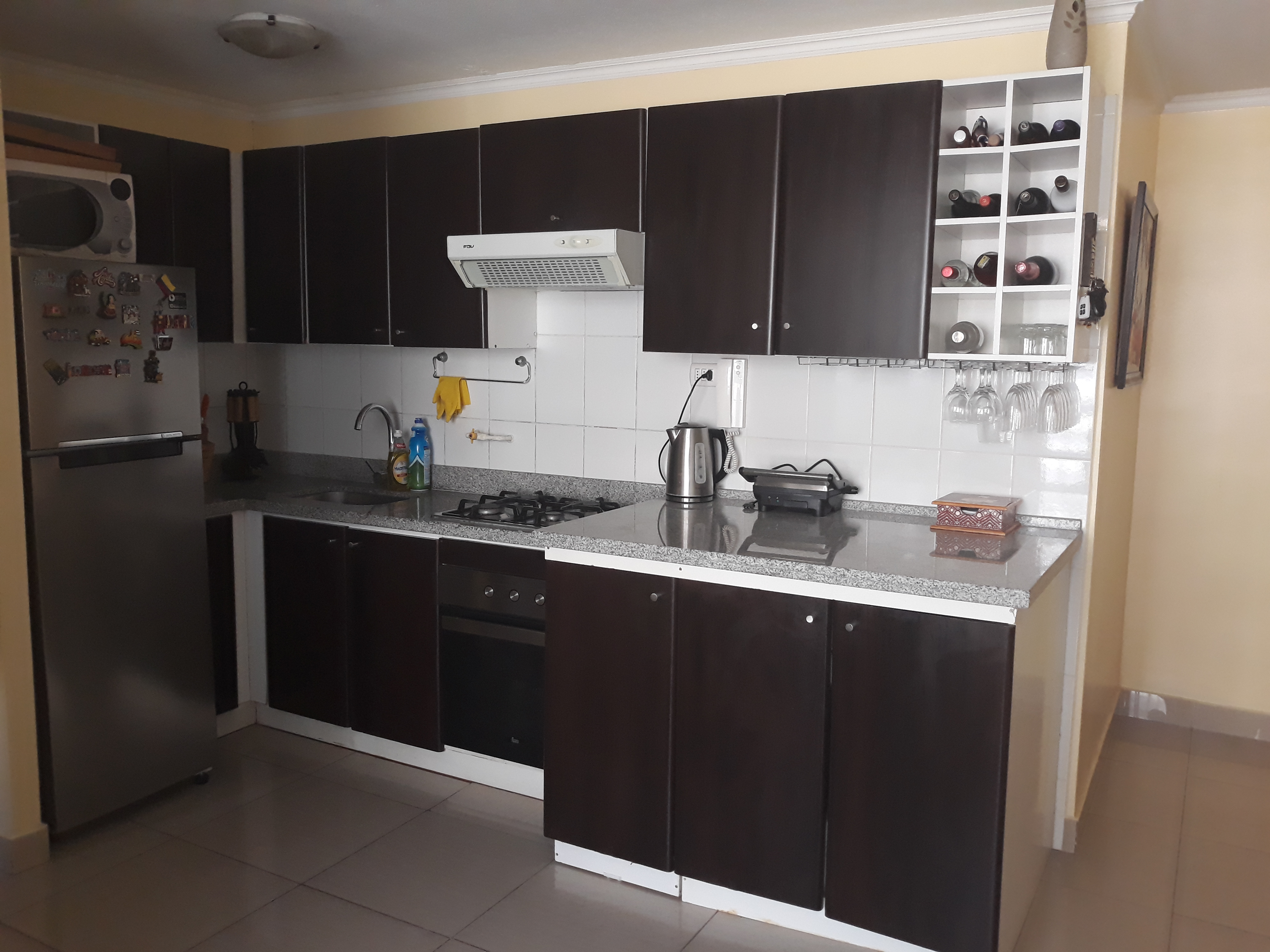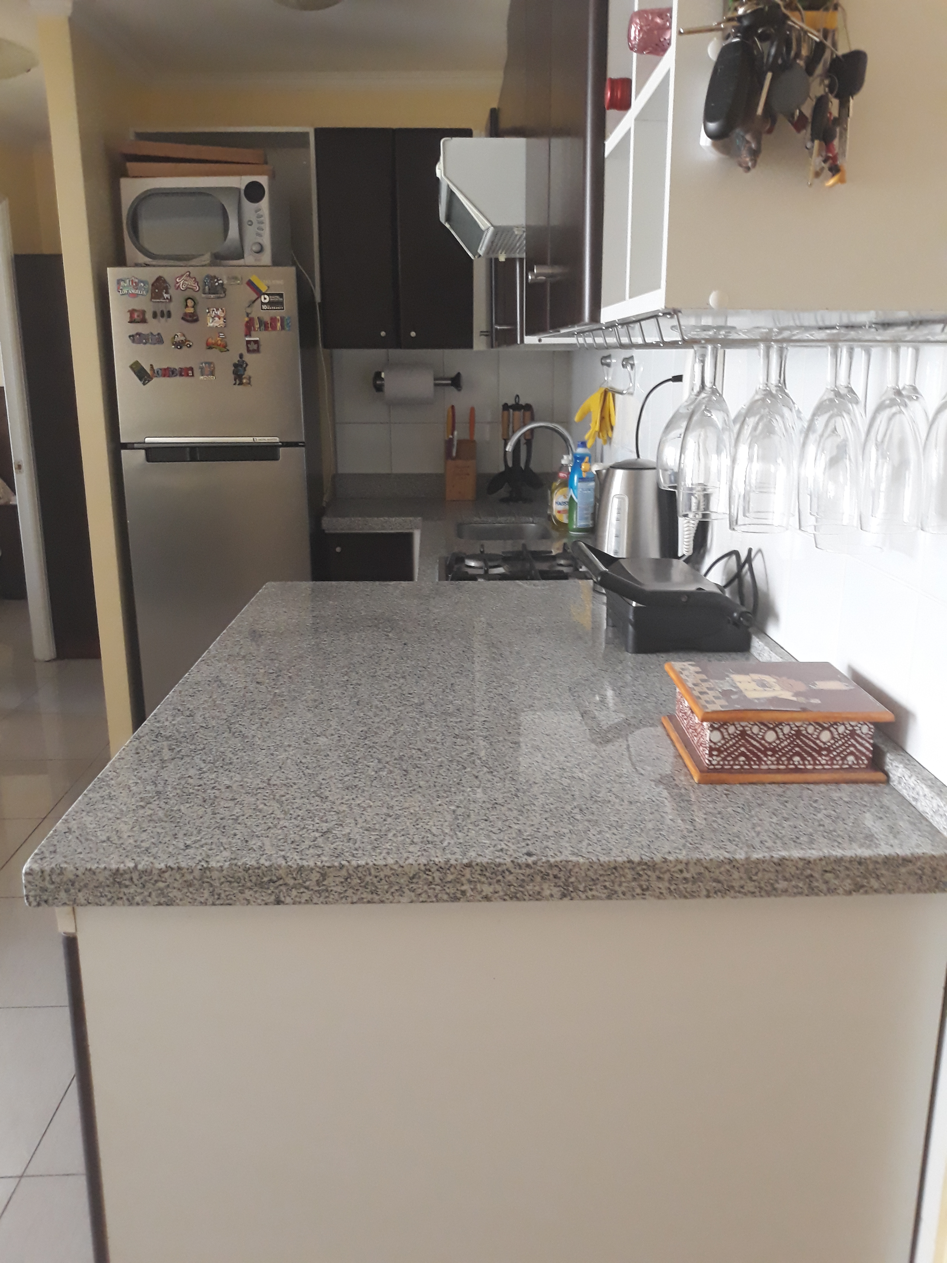 Departamento remodelado, piso de porcelanato, cómodo, living–comedor, cocina integrada con muebles con superficie de granitos, equipada con encimera, horno, campana, conexión a lavadora, 2 dormitorios; 1 dormitorio con waking-closet , 1 dormitorio con closet y closet adicional , 1 baño con vanitorio, tina, espejo adosado muros de porcelanato. Además, el inmueble se entrega con lámparas y cortinaje.